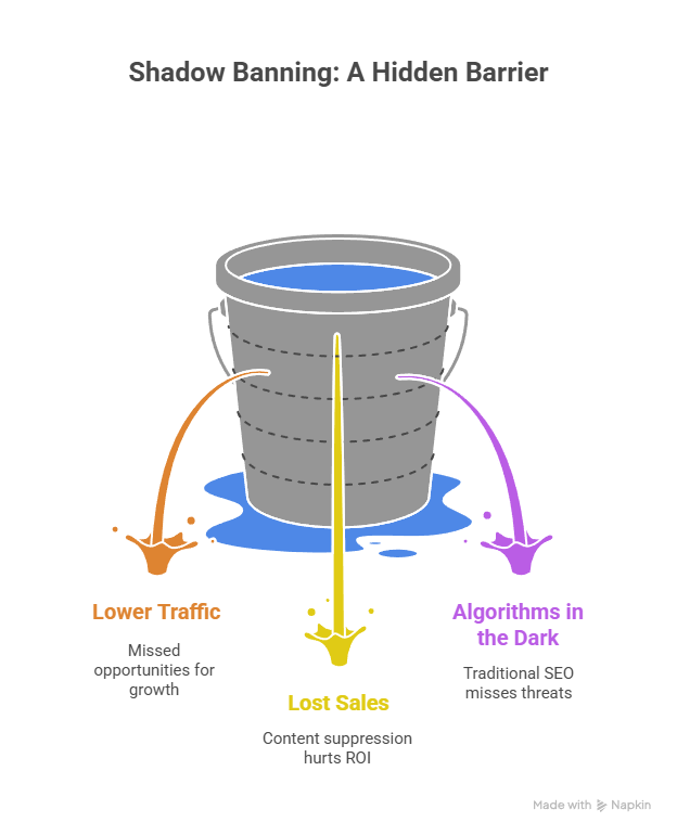 Shadow banning is a hidden barrier that can cripple your growth, leading to lower traffic, lost sales, and missed opportunities. Whether it’s on social media, Google Search, or other digital platforms, content suppression hurts organic reach and ROI. Most traditional SEO and marketing providers miss these threats, leaving you guessing while algorithms keep you in the dark. We shine a light on the problem, pinpointing when and where your content is being suppressed, we do this so you can fight back.